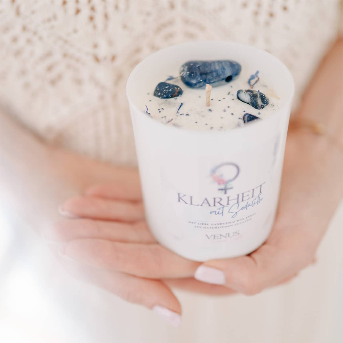 Die Venus-Kerzen vereinen die wohltuende Kraft Aromatherapie mit der feinstofflichen Energie sorgfältig ausgewählter Heilsteine. Jede Kerze wird von Hand mit viel Achtsamkeit und Hingabe gefertigt – aus hochwertigem, ökologischem Sojawachs, das für ein besonders sauberes, gleichmäßiges und langanhaltendes Brennverhalten sorgt.