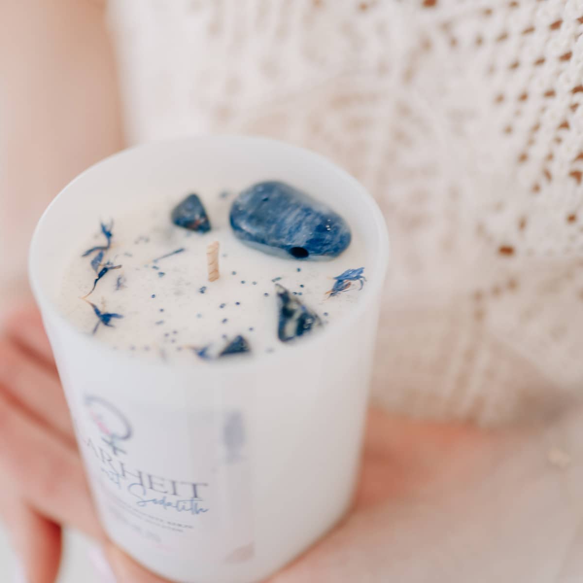 Zarte, natürliche Duftkompositionen entfalten beim Abbrennen sanfte, beruhigende Aromen, die Körper, Geist und Seele umhüllen und entspannen. Die integrierten Heilsteine spiegeln das jeweilige Thema der Kerze wider und verstärken ihre energetische Wirkung – ob zur Förderung von innerer Ruhe, Klarheit, Herzöffnung oder Schutz.